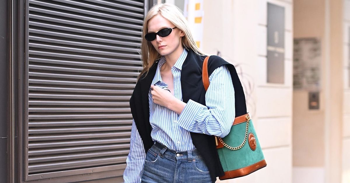 Consani paired her cropped high-waisted blue jeans and black loafers with preppy pieces, including a striped button-down shirt, black triangle scarf, oval sunglasses, and the new yet-to-be-released Versace Pivot bag. I’m tempted to copy the ’90s-inspired outfit from head to toe once it warms up by about 50 degrees. Keep scrolling to join me and shop her look along with some of the best soft loafers on the internet.